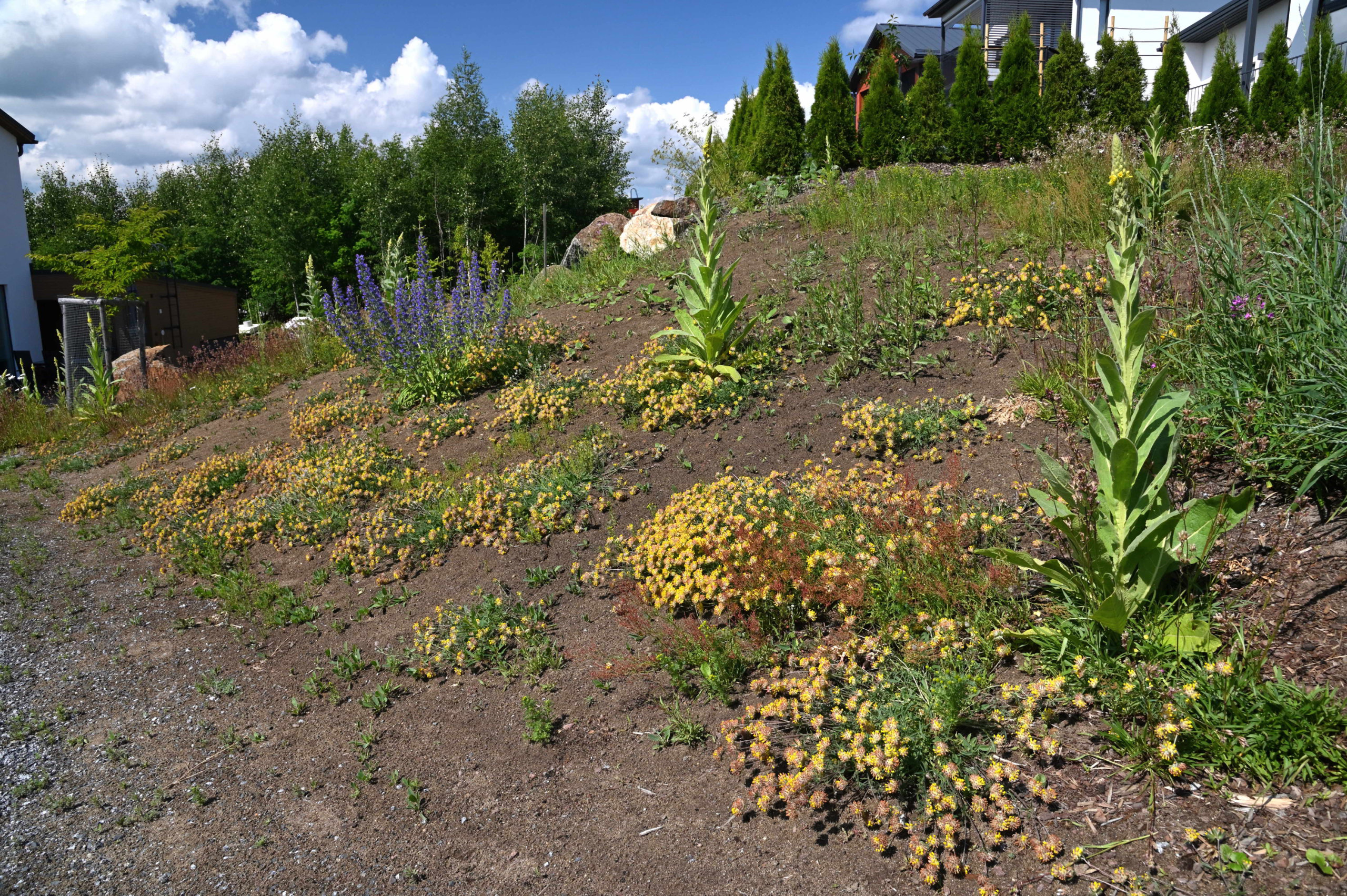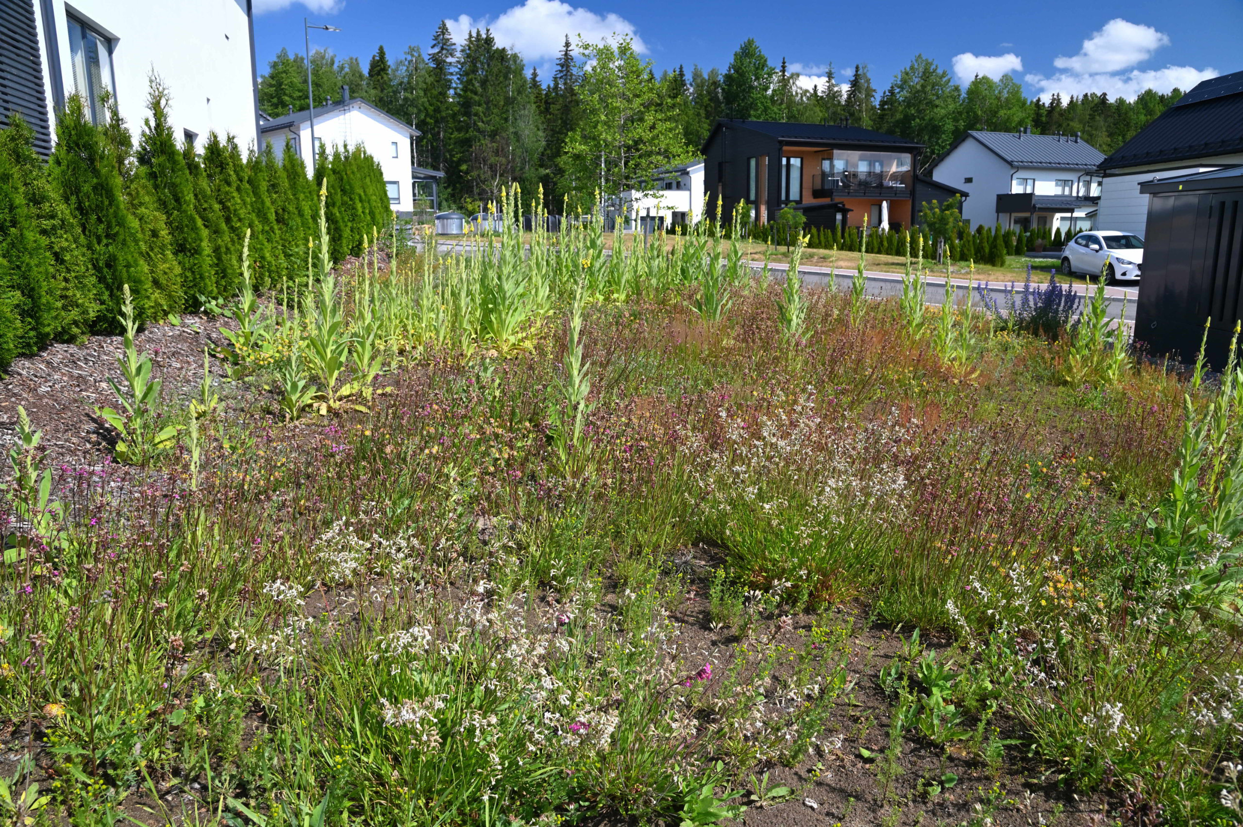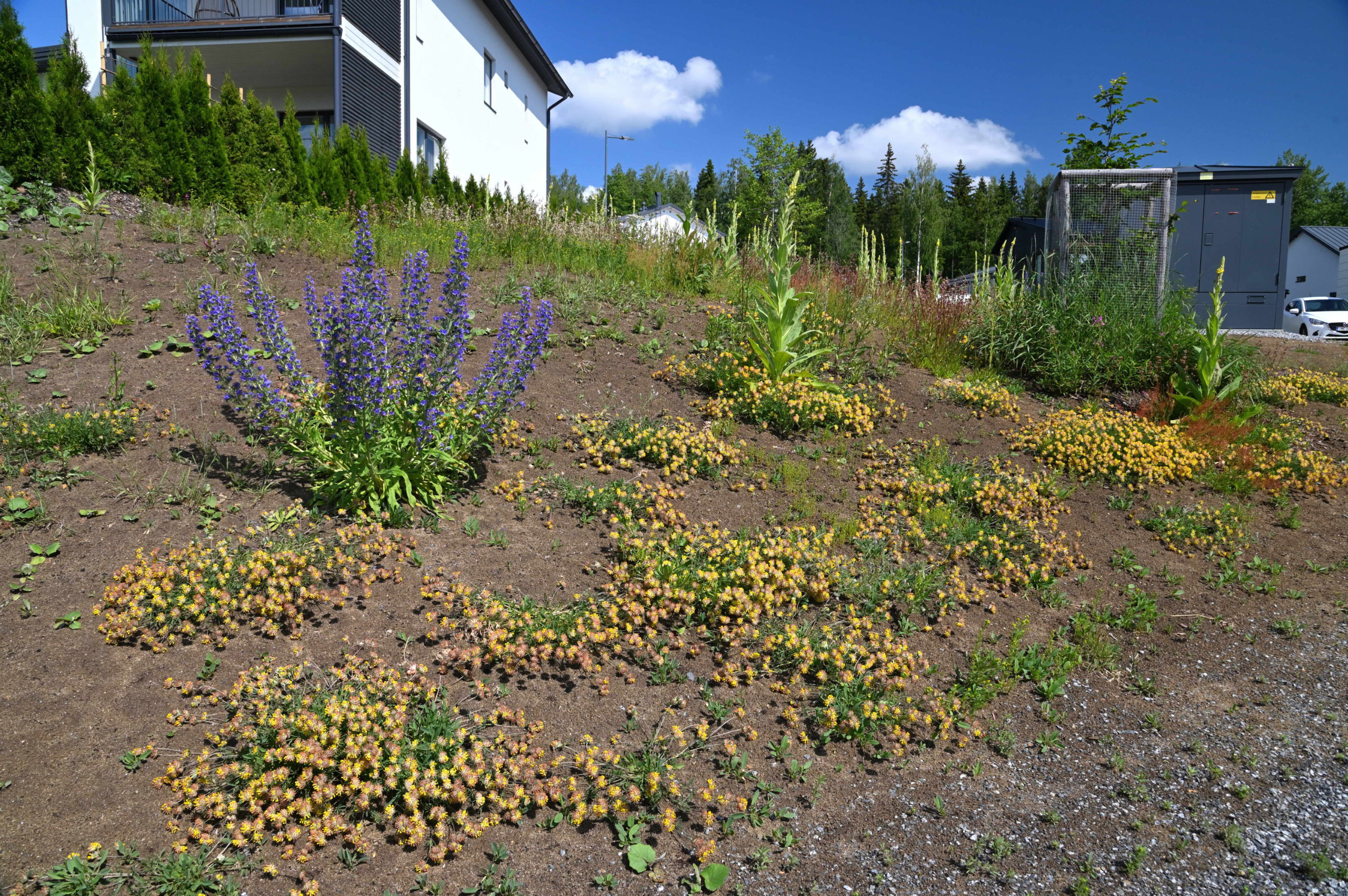 Wild Zone established a meadow on the green areas of the new residential area of Lauha-ahde in Vuores, Tampere, in 2022. The residents of the area participated in establishing the meadow and will take care of it in years to come, as well. The plants sown include Viscaria vulgaris, Verbascum thapsus, Hypericum perforatum, and Trifolium arvense. All the plants of the meadow are of local origin, and their wild population origins are traceable. The vegetation of the meadow will develop slowly during the course of several years. The Lauha-ahde dry meadow is being implemented in cooperation with the City of Tampere.